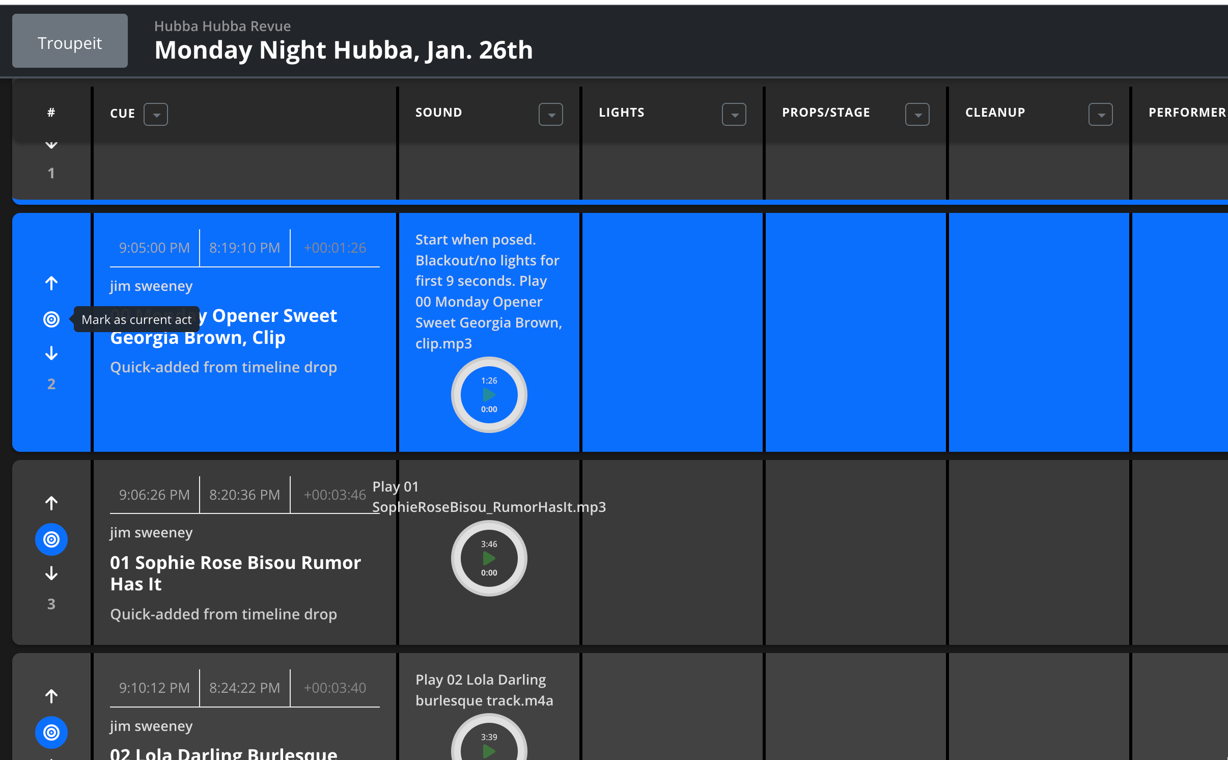 Create detailed cue sheets with timing, technical notes, and media files. Build your show schedule and keep your entire team on the same page.