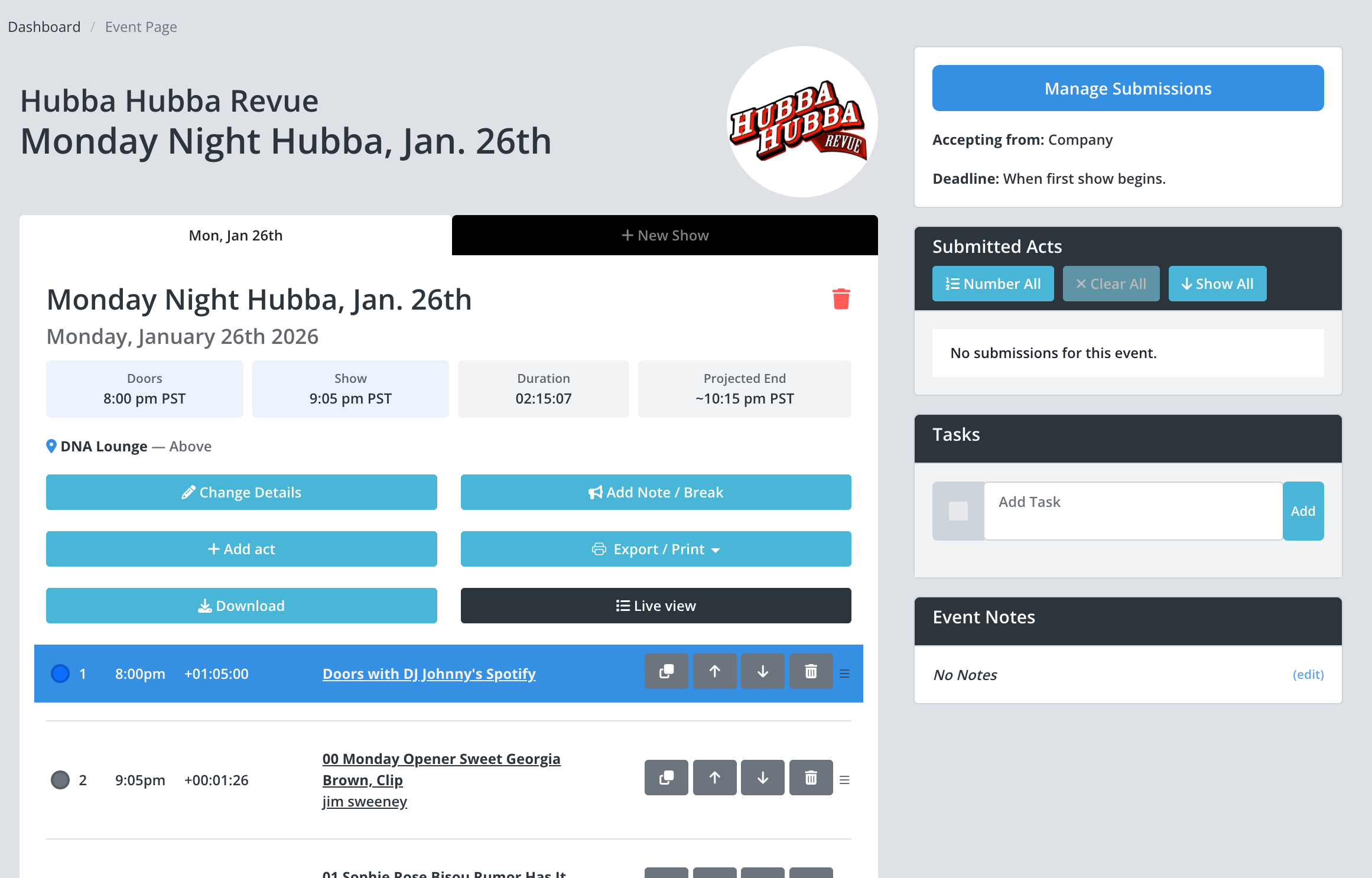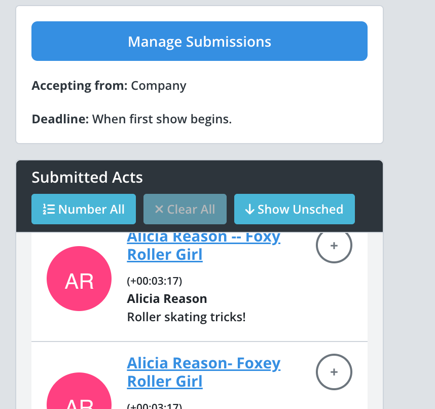 Let performers submit their acts with all technical requirements. Review submissions, organize your lineup, and export to PDF or QLab.